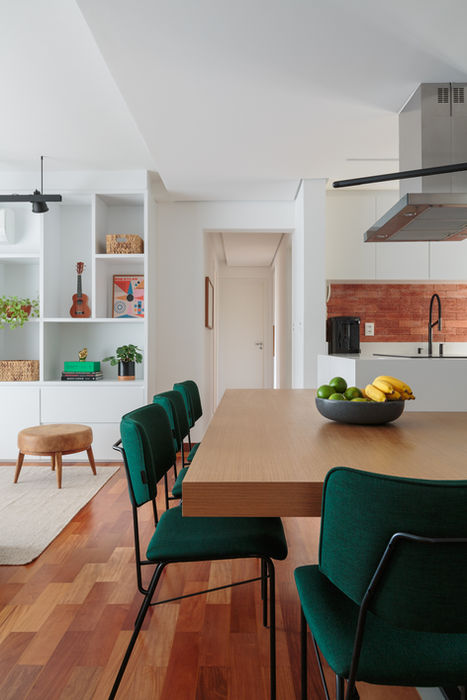 A mudança foi grande nesse projeto! A cozinha foi aberta e o ambiente foi todo integrado com sofá ilha, que delimita a parte de estar e a de tv, e a parte do jantar ganhou uma mesa com folha de madeira natural fixada na ilha onde fica o cooktop.